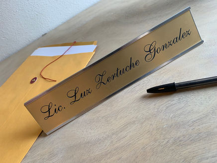 Los portanombres para escritorio le dan un toque profesional a cualquier espacio de trabajo. Elige entre una gran variedad de estilos y materiales y personaliza el portanombres con un nombre y la tipografia que quieras. También se pueden agregar logos.